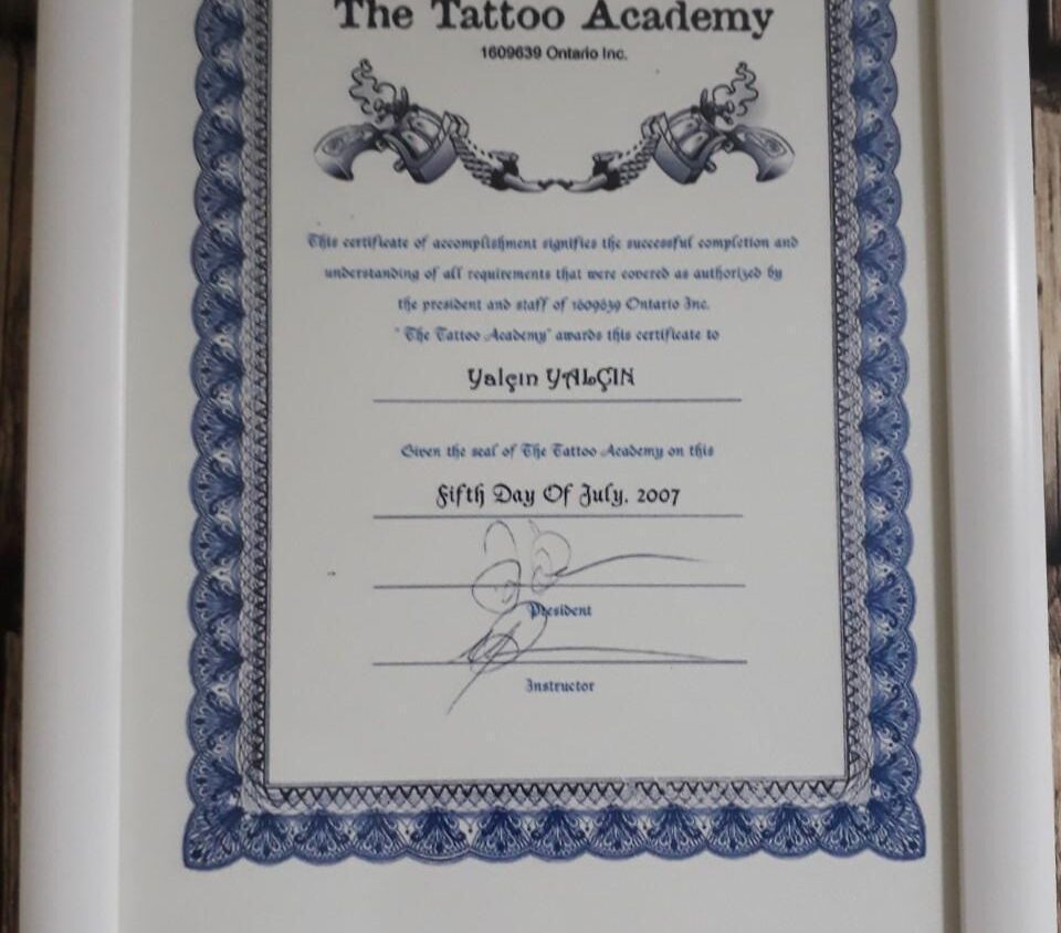 Ontario Canada da eğitimini alıp hak kazandığım The Tattoo Academy sertifikam.
